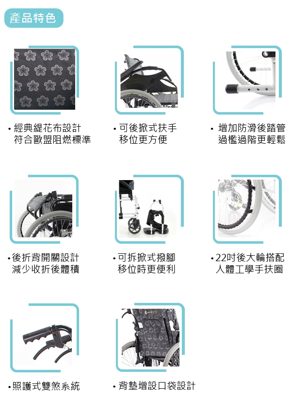 | 可拆式撥腳 可後掀扶手 輕巧好操作 經典緹花布料特色 符合歐盟阻燃標準 22 PU後大輪搭配人體工學手扶圈 商品名稱 CT 3500大輪款品牌 艾品ICare種類 輪椅尺寸 長x寬x 售價:13200 我要購買 |